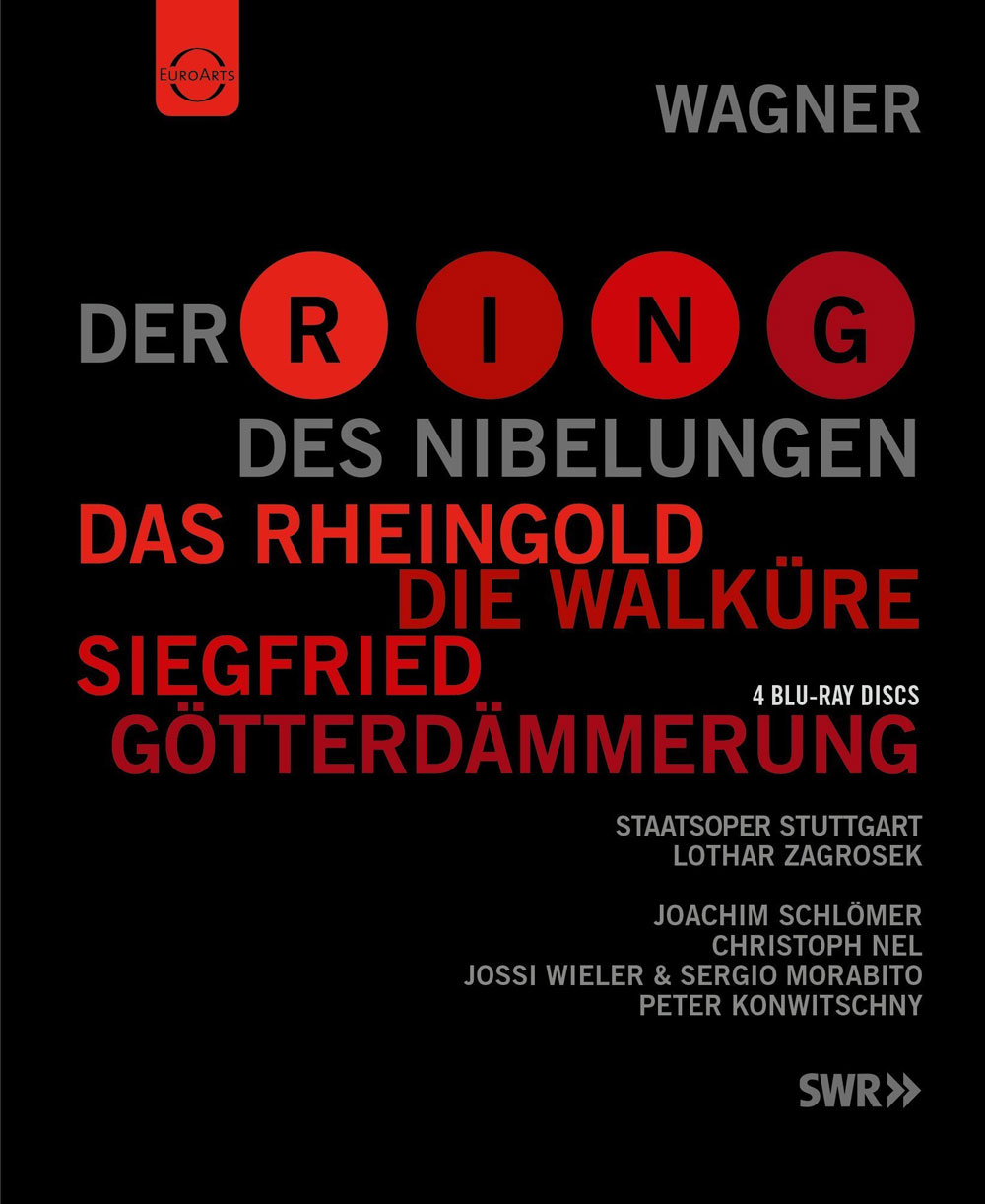 As a special Christmas offer, Euroarts presents the hugely successful Ring cycle from the Staatsoper Stuttgart in a box set. The prologue Rheingold and all three subsequent nights (Walküre, Siegfried, Götterdämmerung) of the "stage festival", as Wagner put it, will be cherished by Wagner enthusiasts and lovers of great theatre all over the world. "Four operas - four stage directors" was the artistic idea behind the 1999/2000 cycle in Stuttgart. Their focus on the individual operas of "Der Ring des Nibelungen" rather than the cycle enabled the stage directors - handpicked by the successful Stuttgart Opera team surrounding Artistic Director Klaus Zehelein - to express their individual insights into the well-known drama of Siegfried and Wotan . Audiences, Wagnerians, and music critics alike were all enthusiastic about the result. As the Financial Times said: "At a time when most are struggling to find something new to say about Wagner, Zehelein shattered convention by allocating the four operas to four different production teams. The results are astonishing as much for the unexpected harmony of the different approaches as for the strength of their diverse insights. Thus deconstructed, Wagner is less totalitarian, more dramatic. The Ring finally looks politically and psychologically modern again. "Directors Joachim Schlömer, Christoph Nel, Jossi Wieler and Peter Konwitschny and their outstanding cast (Angela Denoke, Luana DeVol, Lisa Gasteen, Robert Gambill, Jan-Hendrik Rootering, Wolfgang Schöne, Jon Frederick West et al.) managed an epoch-making artistic enterprise, which will maintain its place as a highlight of Wagner staging for years to come.