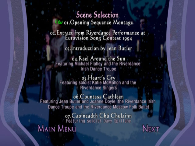 迈克尔·弗拉特利在《大河之舞》中表演的 DVD 首映是《大河之舞精选》的亮点之一,该片对这位十年来一直吸引着现场观众和 PBS 观众的爱尔兰硬鞋舞明星进行了全面的介绍。从 1994 年的欧洲歌唱大赛表演开始,该节目汇集了该节目历史上的许多精彩片段,主要来自三个来源。首先是 1995 年的原版电视节目,由华丽的、创纪录的踢踏舞者弗拉特利和他的搭档吉恩·巴特勒主演。这是 1997 年的纽约市音乐会,科林·邓恩和巴特勒搭档。最后是 2003 年日内瓦的表演,由布伦丹·德加莱和乔安妮·道尔领衔。由于多年来节目的元素和众多表演者发生了变化,每场表演都有自己的特点,而《大河之舞精选》甚至采取了不同寻常的步骤,将各种节目的片段融合成一首曲目。例如,“大河之舞”在三场节目和三组主角之间来回切换。“Lift the Wings”以 Áine Uí Cheallaigh 的独唱两节开始,然后过渡到纽约和日内瓦合唱版的片段。由于独唱版本是该节目后期最大的损失之一,因此 DVD 上至少有部分内容是不错的。同样,由于 Flatley 的完整大河之舞表演尚未在 DVD 上发行,粉丝们会很高兴至少能在这里看到几首曲目。其他后期曲目包括“American Wake”和“Trading Taps”,DVD 菜单屏幕非常清楚地显示哪位表演者或表演者组合正在表演。在这个近两小时的节目中,Jean Butler 不时会进行介绍,这有助于解释一些模棱两可的舞台动作。附加功能包括一部关于该节目历史的全新一小时纪录片、16 分钟的高速后台镜头和 2003 年特奥会的八分钟表演。有些观众可能会觉得介绍或表演切换与流程不协调,而《大河之舞精选》肯定不能替代该节目的完整表演,但它是一个不错的合集,并提供了一些你在其他地方看不到的镜头。